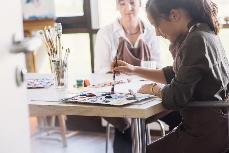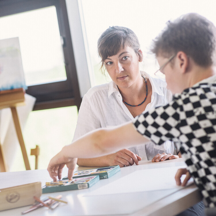 Die Eltern-Kind-Kunsttherapie bietet ein Setting, in dem Eltern mit ihrem Kind in Interaktion treten dürfen. Im Umgang mit Farben und anderen Materialien wie Tonerde geschieht Begegnung über ein gemeinsames Gestalten und Kennenlernen der eigenen Bilder.